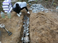 Укладываем под сетку камни, получившиеся после разрушения старого памятника. Это позволит дополнительно укрепить фундамент.